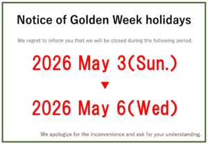 Our company will be closed for Golden Week holidays from Sunday, May 3, 2026 to Wednesday, May 6, 2026.